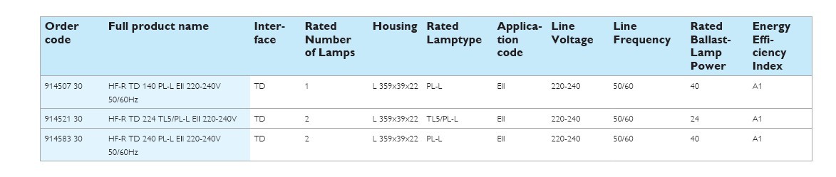Programmed start: flicker-free ignition 0.5 seconds and striation-free operation, no stroboscopic effects. Preheating the lamp electrodes enables the lamps to be switched on and off without reducing life